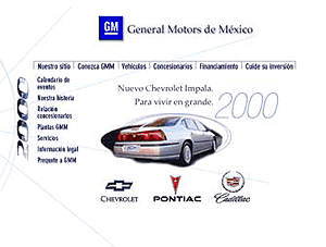 Versiones 1999 y 2000 del sitio corporativo de General Motors de México. Fue la transición entre el web hecho todo a mano, y las páginas generadas dinámicamente, para ofrecer servicios de cotización y localización de vehículos.